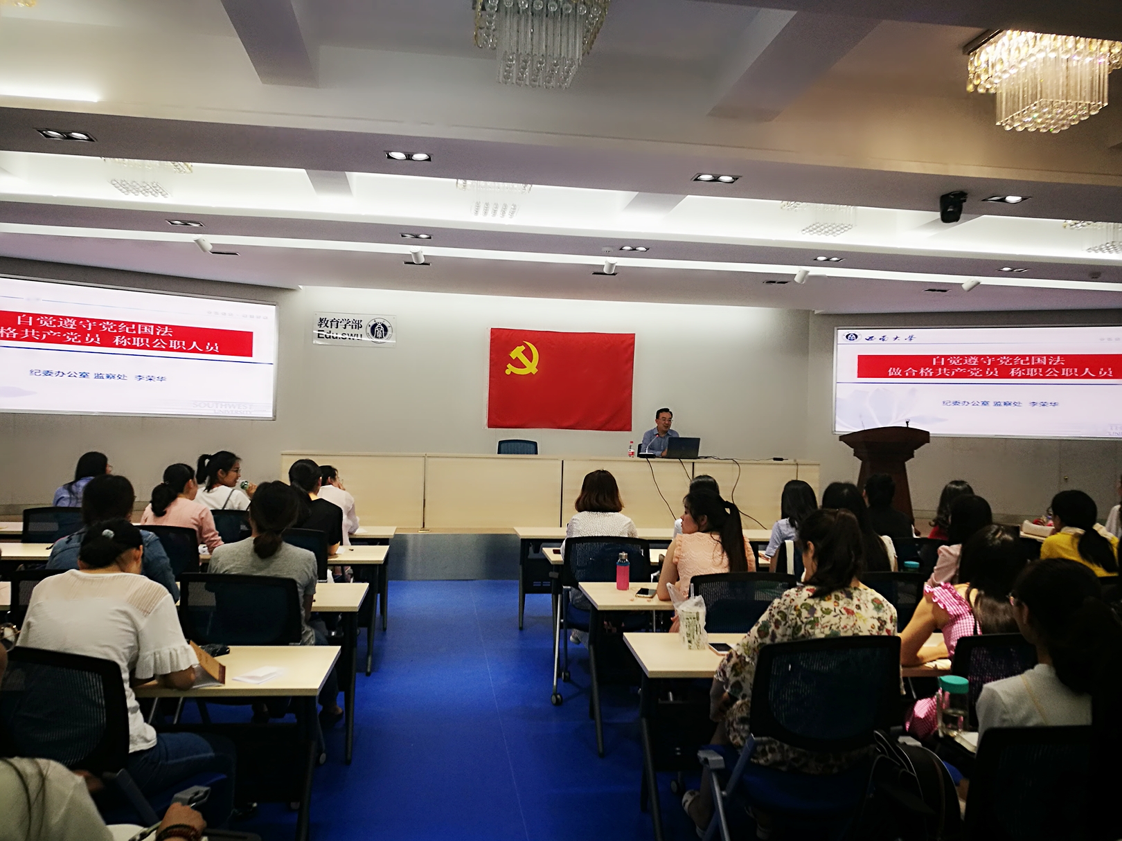 5月29日晚19:00,教育学部毕业生党员教育主题党课在田家炳教育书院811报告厅开展。学校纪委副书记、纪委办主任、监察处处长李荣华以“自觉遵守党纪国法,做合格共产党员称职公职人员”为主题,为2018届毕业生党员上了意义深远的一课。